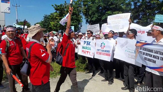 1.298 Pegawai Tidak Tetap (PTT) di lingkungan Dinas Pendidikan menggelar aksi demo di depan Kantor Pemerintahan Terpadu (KPT) Kabupaten Brebes, Jawa Tengah. Mereka menuntut untuk diangkat sebagai Pegawai Pemerintah dengan Perjanjian Kerja (P3K).