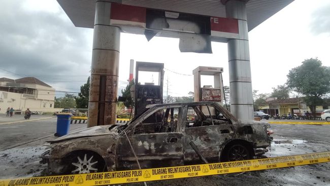 Sebuah mobil sedan terbakar saat tengah mengisi BBM di SPBU Kecamatan Ngadirojo, Wonogiri. Satu orang mengalami luka dalam kejadian tersebut.