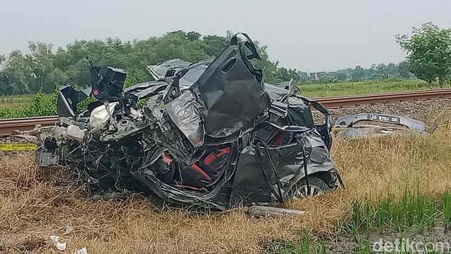 Pantauan detikJateng, kondisi mobil Etios warna abu-abu silver ringsek. Mobil dengan nomor polisi AD 8740 DO itu terlempar sekitar 20 meter dari perlintasan kereta api.