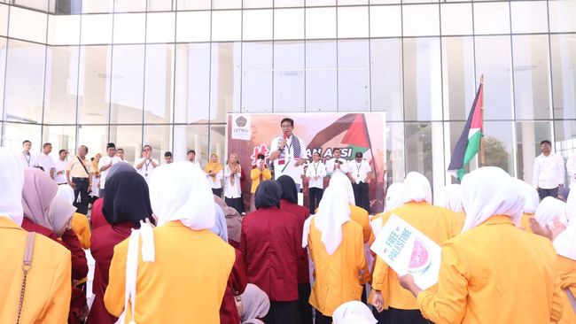 Ratusan mahasiswa berkumpul dengan poster, spanduk, dan bendera Palestina. Mereka mengekspresikan dukungan untuk rakyat Palestina yang menderita akibat konflik kemanusiaan yang berkepanjangan. Tak hanya, mahasiswa, tenaga pendidikan, dosen hingga rektor juga turun tangan mengikuti aksi.