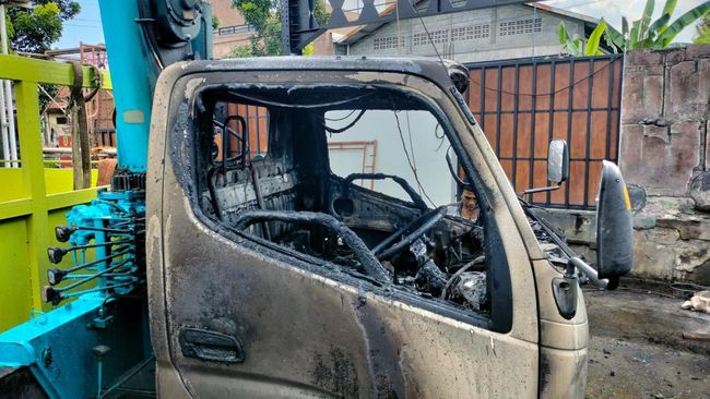 Satu unit truk crane terbakar di kampung Dadimulyo, Kalurahan Gergunung, Kecamatan Klaten Utara, Klaten. Penyebabnya, ujung crane menyenggol kabel listrik.