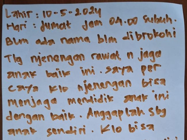 "Lahir 5 Mei 2024, hari Jum'at jam 04.00 subuh. Belum ada nama belum dibrokohi (syukuran kelahiran). Tolong njenengan (anda) rawat dan jaga anak baik ini, saya percaya kalau njenengan bisa merawat dan mendidik anak ini dengan baik. Anggaplah sebagai anak sendiri. Kalau bisa tolong njenengan rawat sendiri jangan diadopsi orang lain. Dia anak yang kuat anak hebat. Dan semoga menjadi anak yang Sholeh aamiiin."