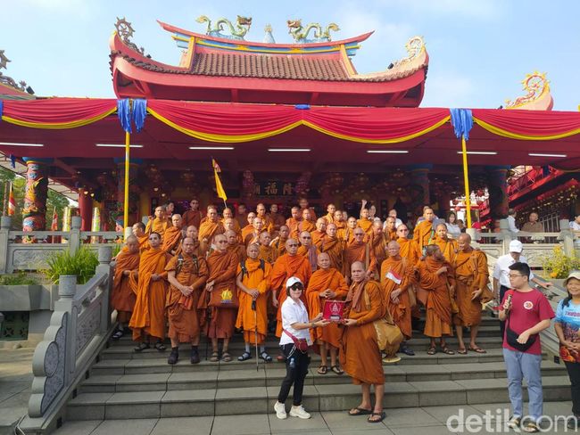 Pantauan detikJateng, Senin (20/5) sekitar pukul 06.00 WIB, para biksu thudong sedang membaca paritta (doa) di Kelenteng Liong Hok Bio Magelang, diikuti umat Buddha lainnya.