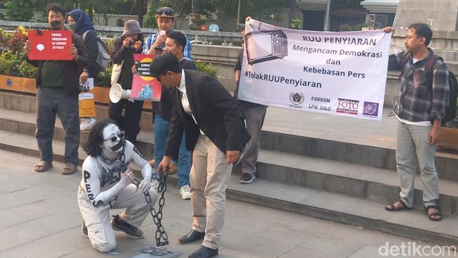 Aksi damai itu diwarnai dengan drama teatrikal, pembentangan sejumlah poster, dengan mulut para pewarta di Kota Solo ditutup solasi simbol pembungkaman kebebasan pers. 'RUU Penyiaran Mengancam Demokrasi dan Kebebasan Pers', demikianlah yang ditulis dalam salah satu spanduk.