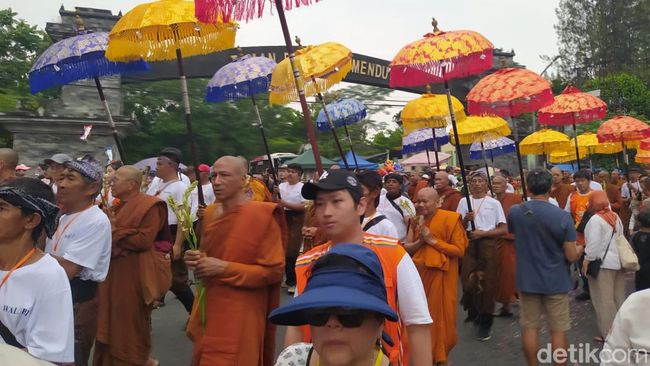 "Hari ini, kembali untuk merayakan Waisak memulainya dari Candi Mendut sebagai sentral memusatkan umat. Yang didahului dengan menyemayamkan air, menyemayamkan api sebagai api penerang. (Air dan api) dibawa menuju Candi Borobudur. Nah diarak dengan penuh hati ketenangan itu ada namanya meditasi berjalan sebetulnya, menyadari sedang berjalan setiap langkahnya sambil merenungkan kebenaran luhur dari ajaran Buddha," sambung Supriyadi.