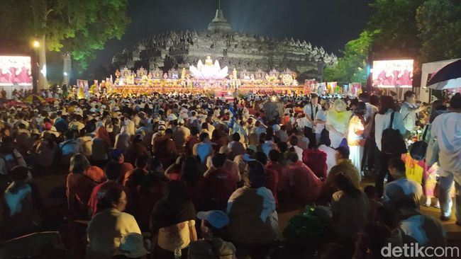 Puluhan ribu umat Buddha memadati pelataran Candi Borobudur. Para umat ini untuk mengikuti detik-detik Waisak yang jatuh pada pukul 20.52.42 WIB.