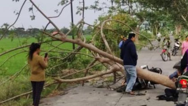 Sepeda motor Supra X nomor polisi K 5001 BC yang dikendarai FS (40) dan OA (22) tertimpa pohon yang ambruk di jalan Desa Mlese, Kecamatan Cawas, Klaten, sore tadi. Akibat kejadian itu motor rusak berat dan penumpangnya luka.