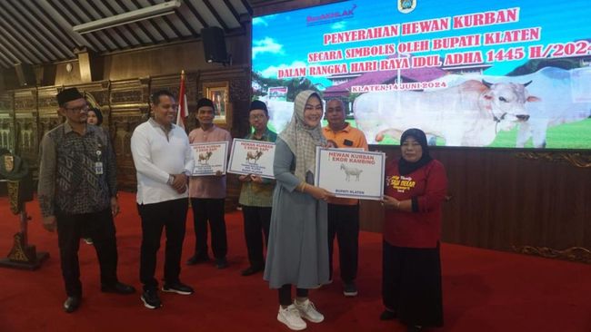 "Saya menyerahkan hewan kurban, sejumlah 12 ekor sapi dan 45 ekor kambing. Alhamdulillah ini pengadaan dari Kepala OPD dan jajaran Pemerintah Kabupaten Klaten," kata Sri Mulyani di halaman Pendapa Setda Klaten, Jumat (14/6/2024).