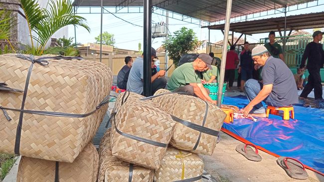 Tampak puluhan besek tertumpuk di samping panitia yang tengah memotong daging kurban di Masjid Agung Al Aqsha Klaten. Keranjang anyaman dari bambu itu akan digunakan sebagai wadah untuk membagikan daging kurban kepada masyarakat.