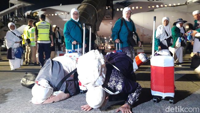 Tangis haru dan rasa gembira mewarnai kedatangan jemaah haji. Bahkan, sejumlah jemaah terlihat langsung melakukan sujud syukur setelah turun dari pesawat.
