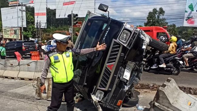 Selain itu, mobil boks juga dalam keadaan terguling di pembatas jalan yang memisahkan arah menuju Tol Semarang dan jalan nasional menuju Salatiga.