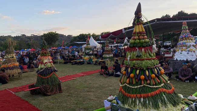 Sebelumnya, sebanyak 11 gunungan dari masing-masing RW di Desa Kebondalem Kidul, pun diarak dari lapangan menuju candi. Tampak gunungan megah hasil karya para warga yang berisi hasil bumi, jajanan pasar, hingga makanan ringan.