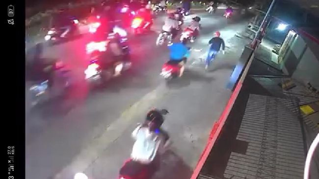Pada rekaman CCTV berdurasi tiga menit yang diunggah, terlihat sekitar 20 motor dengan penumpang anak muda saling berboncengan. Awalnya beberapa terlihat berhenti dan disusul rombongan di belakang menggeber gas.