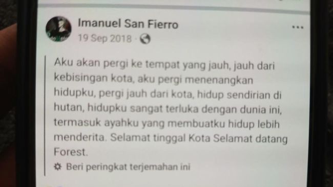 Sementara unggahan terakhir soal keresahan hatinya dibuat Elia pada 19 September 2018. Di situ ia menulis 'Aku akan pergi ke tempat yang jauh, jauh dari kebisingan kota. Aku pergi menenangkan hidupku, pergi jauh dari kota, hidup sendirian di hutan. Hidupku sangat terluka dengan dunia ini, termasuk ayahku yang membuatku hidup lebih menderita. Selamat tinggal kota selamat datang forest'.