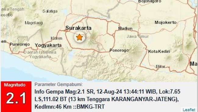 Gempa bumi berkekuatan magnitudo (M) 2,1 terjadi di Kabupaten Karanganyar, Jawa Tengah, siang ini. Pusat gempa di darat.