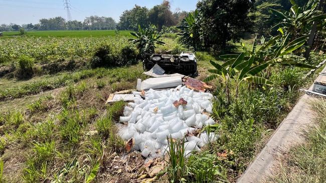 Dari foto yang diterima detikJateng, tampak bongkahan es berceceran keluar dari truk boks tersebut.