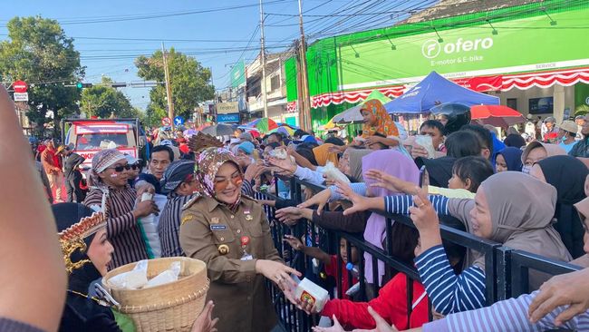 Pemkab Klaten menggelar karnaval pembangunan dalam rangka memperingati Hari Ulang Tahun (HUT) ke-79 Republik Indonesia (RI). Bupati Klaten Sri Mulyani bagi-bagi beras dan jajanan kepada ratusan warga yang menyemarakkan kegiatan tersebut.