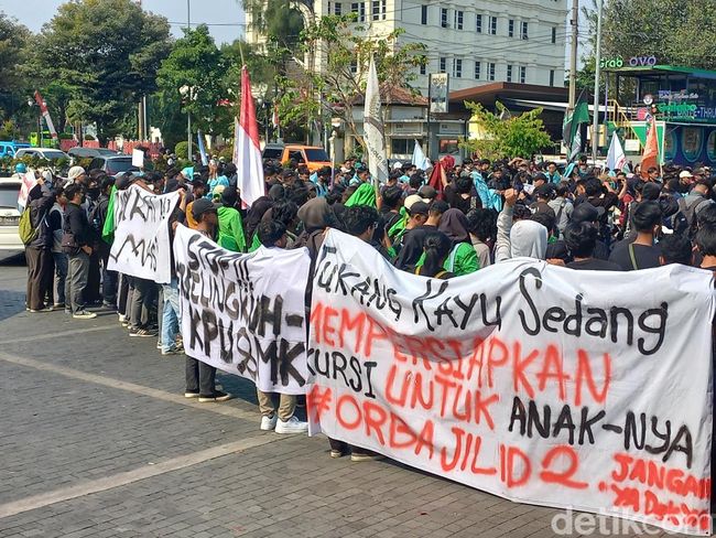 Mahasiswa membentangkan berbagai spanduk dalam aksi demo itu yang bertuliskan 'Tukang Kayu Sedang Mempersiapkan Kursi Untuk Anaknya', 'Koalisi Indonesia Melawan', dan sebagainya.