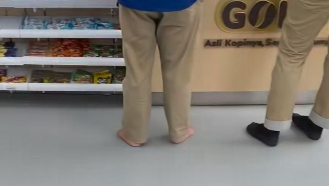 Kemudian, Rachma menunjukkan keadaan di dalam toko. Terlihat para pengunjung sedang mengantri di kasir tanpa mengenakan alas kaki, ada pula yang hanya memakai kaus kaki.