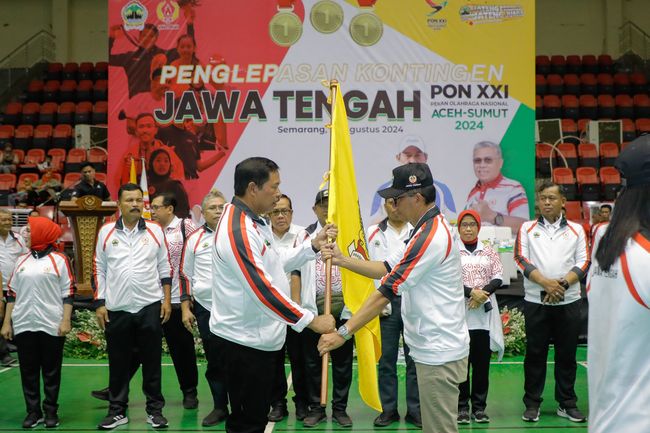Pj Gubernur Jateng Nana Sudjana melepas 1.141 kontingen Jateng yang akan bertanding pada Pekan Olahraga Nasional (PON) XXI tahun 2024 di Aceh-Sumatera Utara (Sumut) pada 8-20 September 2024. Nana menjelaskan kontingen Jateng terdiri dari 758 atlet dan 383 pelatih serta official.