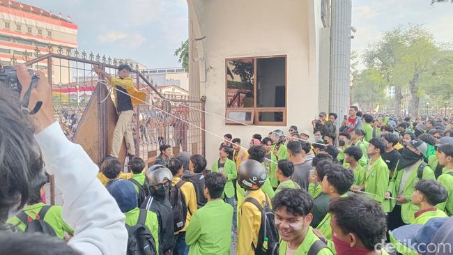 Pantauan detikJateng di Jalan Pemuda Semarang, Senin (26/8/2024) pukul 16.20 WIB, terlihat massa memaksa masuk ke Balai Kota yang merupakan Kantor Wali Kota Semarang dan Kantor DPRD Kota Semarang. Usai pagar jebol, polisi dan massa mahasiswa sempat saling dorong. Massa juga nampak melempar botol air mineral ke arah polisi.