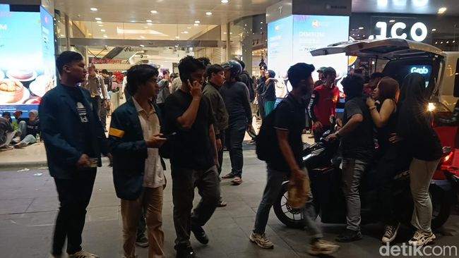 Pantauan detikJateng di Mal Paragon, Jalan Pemuda, Semarang, Senin (26/8/2024), terlihat hingga pukul 19.41 WIB massa masih berada di depan mal tersebut. Mereka terlihat masih menggunakan identitas kampusnya masing-masing.