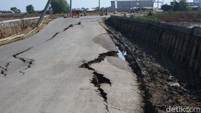 "Kemarin ada kegiatan normalisasi Sungai Juwana namun setelah ada pengerukan lamban laun dari jalan yang atas menuju ke Pulau Seperat ini terus ada retakan bawahnya bergeser. Akibatnya jalan kemiringan sekitar 25 derajat termasuk tiang listrik 45 derajat," kata Sunaryo kepada detikJateng di lokasi.