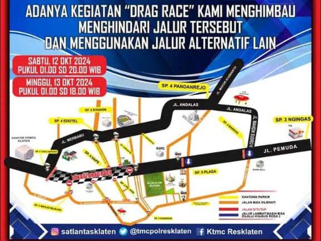 Sebagian ruas Jalan Pemuda, kota Klaten, hari ini ditutup karena ada event balap motor trek lurus (drag race) di jalan protokol tersebut. Berikut jadwal penutupan jalannya, rekayasa lalu lintas (lalin), dan jalur alternatifnya.