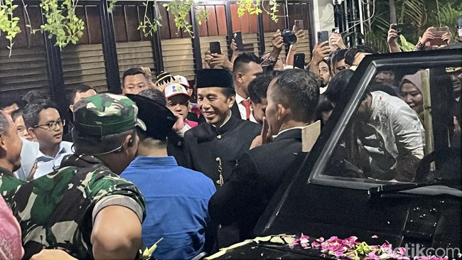 Jokowi dan Iriana tiba di kediaman sekira pukul 19.23 WIb. Jokowi dan Iriana juga tampak melambaikan tangan ke warga.