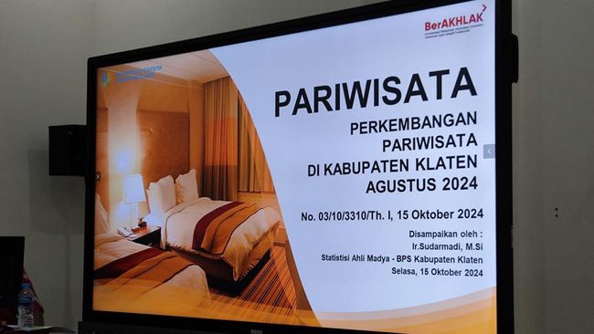 Badan Pusat Statistik (BPS) Klaten memaparkan data tentang perkembangan statistik pariwisata Agustus 2024 di gedung Diskominfo Klaten. Disebutkan tingkat penghunian kamar (TPK) hotel di Klaten tertinggi pada Agustus 2024 mencapai 18,78 persen.
