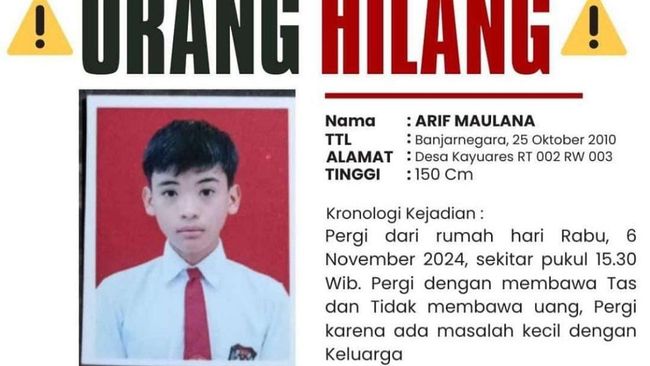 Informasi ini diunggah akun media sosial instagram @instambanjarnegara pada Rabu (6/11/2024) pukul 22.30 WIB. Dalam postingan tersebut, Arif disebutkan meninggalkan rumah hari ini, Rabu (6/11) pukul 15.30 WIB.