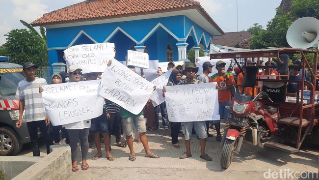 Massa juga membawa berbagai tulisan di depan kantor desa. Seperti 'Wong Tapen Butuh Keadilan', 'Ora Slamet Ora Ana Kamituo lah' hingga tulisan 'Pak Prabowo tolong Kami'.