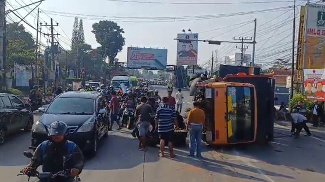 Truk muatan pasir terguling di Jalan Diponegoro, Kabupaten Semarang yang merupakan akses utama Salatiga-Semarang. Arus lalu lintas sempat diberlakukan contraflow selama proses evakuasi berjalan.