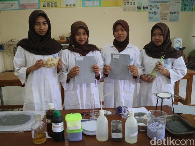 Berikutnya adalah pembuatan kertas karbon. "Untuk pembuatan kertas langkahnya campur serai dan nano karbon dari tongkol jagung menjadi bubur dan dicampur dengan kertas bekas. Lalu kita cetak dengan alat. Lalu dijemur selama 7 hari," terang dia.