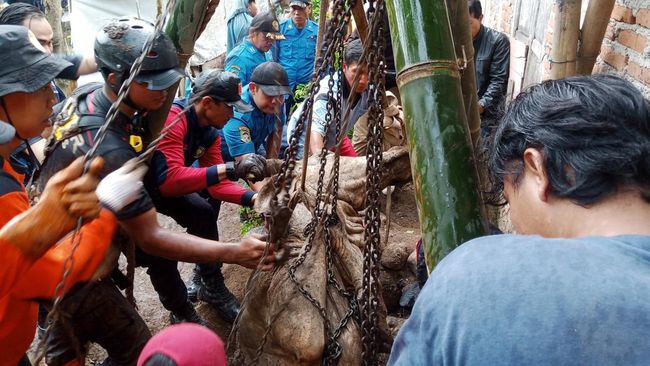 "Langsung telepon Damkar karena yang punya peralatan lebih lengkap. Kedalaman sumur 10 meter, posisi dievakuasi masih hidup. Beratnya sekitar 700 kilogram, karena kondisinya lagi hamil," jelasnya.