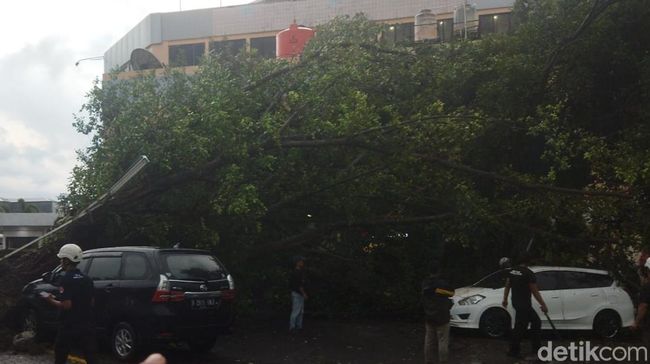 "Hujan disertai dengan angin kencang dan ini berdampak pada satu pohon tumbang. Untuk mobil yang tertimpa tidak mengalami kerusakan berat tapi lecet saja, kerusakan ringan," jelas Anjung.