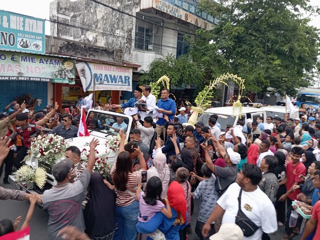 Pantauan detikcom, Jumat (22/11/2024) Jokowi bersama dengan pasangan calon nomor urut 2 itu menaiki jeep atap terbuka. Mereka berada di mobil yang sama untuk menyapa warga.