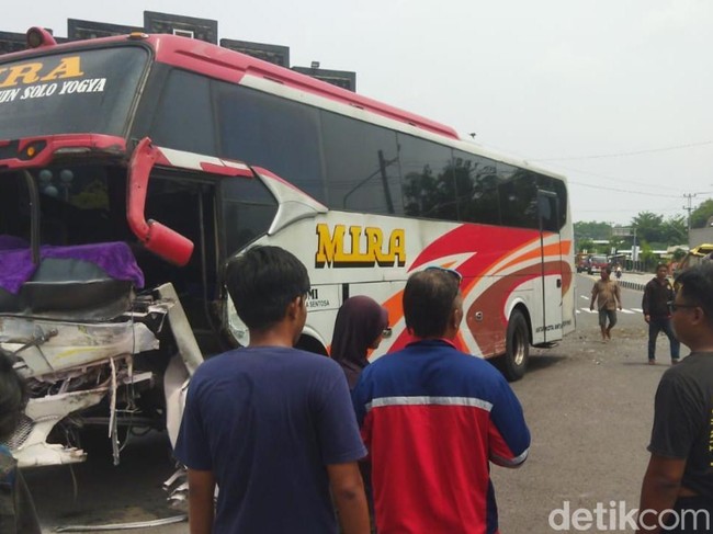Satu unit bus PO Mira terlibat kecelakaan dengan truk dump bermuatan pasir di simpang empat Tegalyoso, Kecamatan Klaten Selatan, Klaten. Bus dan truk itu mengalami kerusakan di bagian depan.