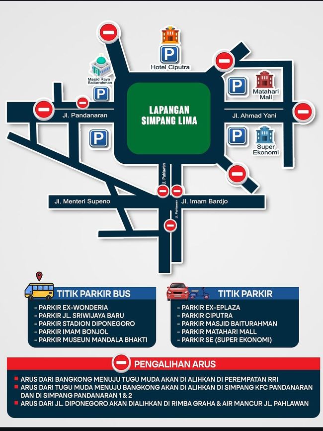- Arus dari Jl. Diponegoro akan dialihkan di Rimba Graha dan air mancur Jalan Pahlawan.
