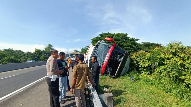 Akibat benturan tersebut, bus oleng ke kiri dan menabrak pembatas jalan. Bus baru berhenti setelah terguling.