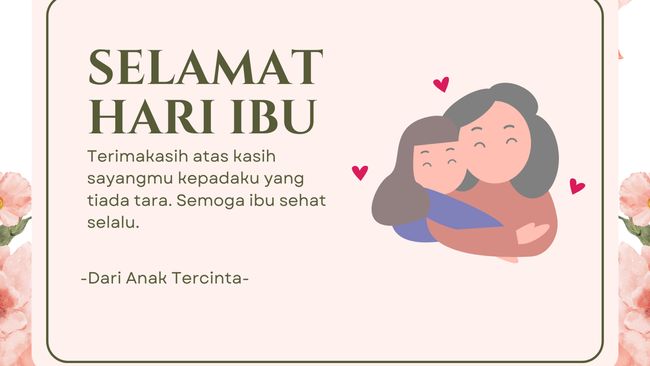 - Ma, selamat Hari Ibu. Aku tahu tidak mudah membesarkan dan merawat kami selama ini. Namun, hal yang perlu mama ingat adalah kami sangat menghargai dan bersyukur atas segala hal yang telah dilakukan oleh mama. Semoga Tuhan membalas kebaikan mama dengan beribu kebaikan lainnya.