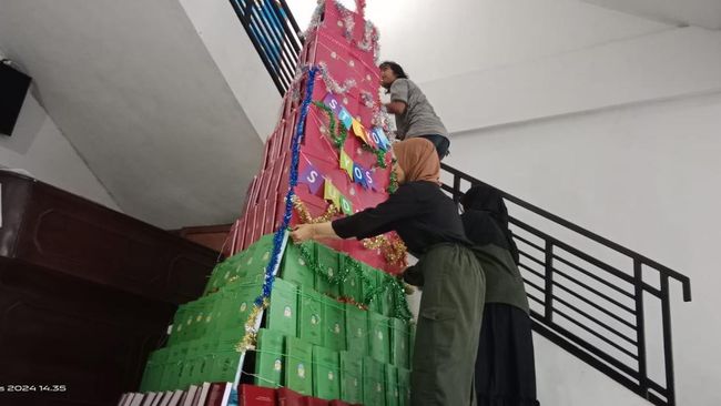 Salah satu pemandangan unik ada di Sekolah Tinggi Ilmu Komputer (STIKOM) Yos Sudarso Purwokerto. Sejumlah mahasiswa menyusun pohon Natal dari kumpulan skripsi yang sudah dijilid berwarna-warni.