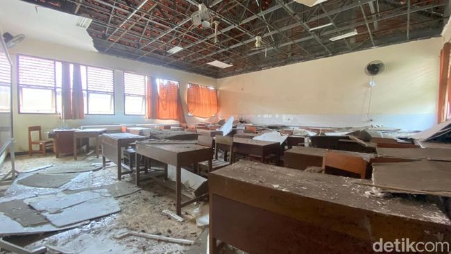 Terlihat di salah satu kelas di lantai 2, yakni kelas untuk para siswa kelas 10, eternit kelas itu ambrol di atas meja-meja sekolah. Serpihan eternit pun masih berserakan di sekolah.