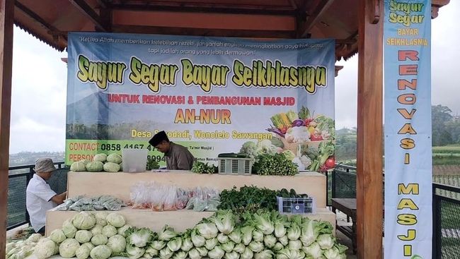 Warga Negeri Kahyangan, Kecamatan Sawangan, Kabupaten Magelang, punya cara unik untuk mencari dana pembangunan masjid di desa mereka. Alih-alih mencari donasi, mereka memilih membuka warung sayur dengan konsep bayar seikhlasnya.