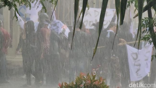 Massa aksi menuntut 'adili Jokowi' berlangsung di depan Mapolresta Solo. Massa berkostum wayang itu berorasi di tengah guyuran hujan.