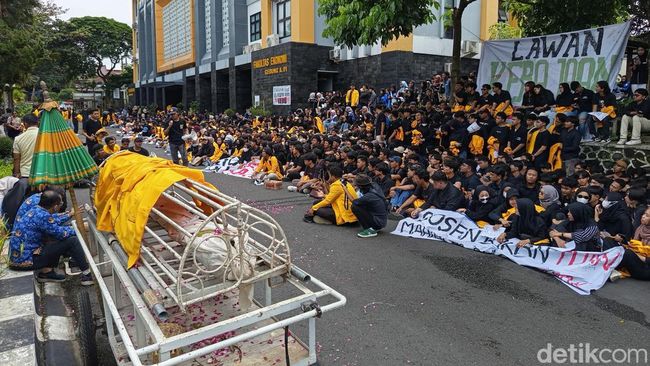 Dalam aksinya massa membawa keranda jenazah. Di atas keranda jenazah diberi jaket almamater.