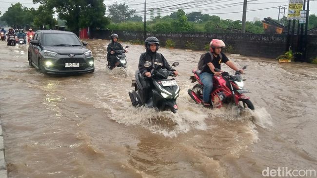 "Air mulai naik ke jalan dan membuat antrean kendaraan sampai sekitar 300 meter. Sebagian masuk kampung," kata Bambang.
