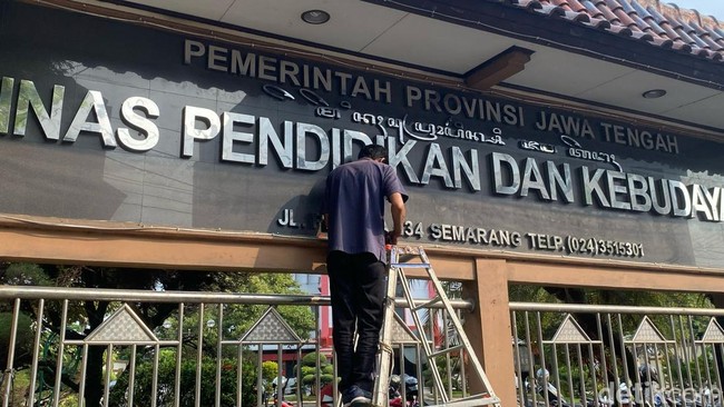 Pantauan detikJateng di Kantor Disdikbud Jateng, Kecamatan Semarang Tengah, tampak pekerja tengah mencopot tulisan aksara Jawa di papan Disdikbud Jateng siang ini.