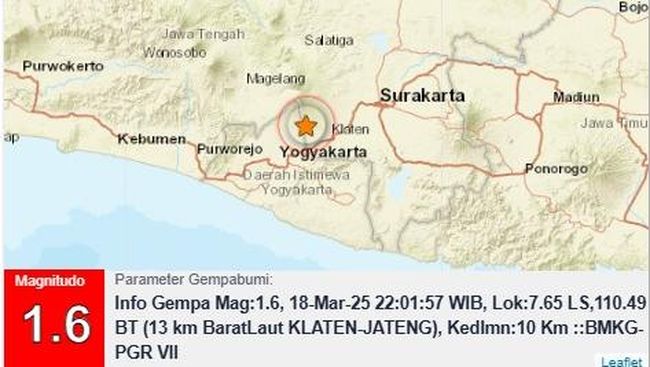 Gempa bumi berkekuatan magnitudo (M) 1,6 terjadi di Kabupaten Klaten malam ini. Pusat gempa di darat.