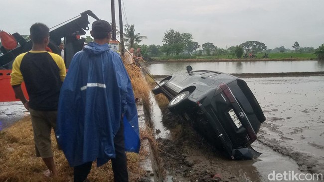 Pantauan detikJateng di lokasi, posisi mobil miring di atas tanah sawah yang baru selesai dibajak. Bagian kanan bodi mobil rusak pecah karena menghantam lahan sawah. Mobil masuk sawah dengan ketinggian sekitar dua meter dari jalan raya.